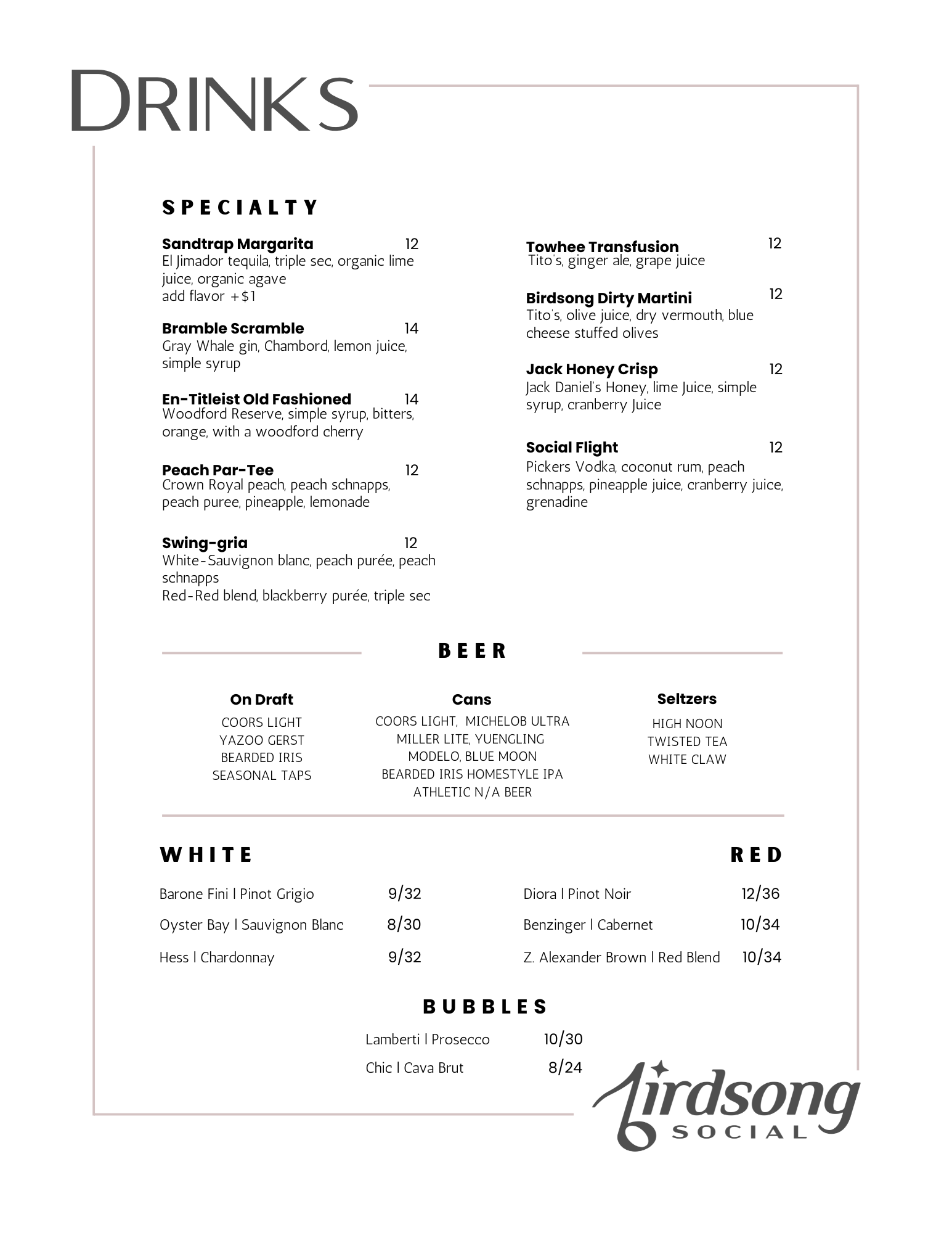 Birdsong Social focuses on seasonal, approachable menus defined by local availability along with an array of beers, wines, and cocktails. In addition to our all day menu, enjoy rotating dinner specials and grab and go options for golfers at the turn. Kids menu available upon request.